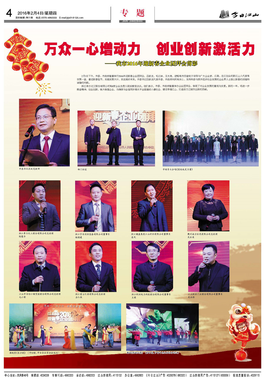 2月3日下午,市委、市政府隆重舉行2016年迎新春企業團拜會,呂躍龍、毛江妹、王水亮、舒暢等市四套班子領導與廣大企業家、江商、在江創業的新江山人代表等歡聚一堂,喜迎新春佳節,共商發展大計,共話美好未來。市委書記呂躍龍代表市委、市政府向所有關心、支持和參與我市經濟社會發展的企業界人士致以新春的祝福和誠摯的問候。浙江希爾化工股份有限公司等8家企業負責人現場接受訪談。他們表示,市委、市政府隆重舉辦企業團拜會,體現了對企業發展的重視與關愛。新的一年,將進一步振奮精神,創業創新,做大做強企業,為確保與全省同步高水平全面建成小康社會,建設幸福江山、打造活力之城作出新的貢獻。