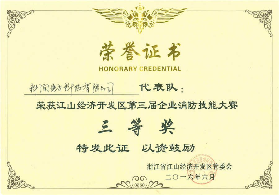 2016年6月25日上午8:00,由市總工會(huì)組織的江山經(jīng)濟(jì)開(kāi)發(fā)區(qū)第三屆企業(yè)消防技能大賽在江東工業(yè)園興工路九陽(yáng)光電公司舉行,我公司黨支部書(shū)記樂(lè)田光等5人組成的代表隊(duì)參加了本次比賽,最終憑借過(guò)硬的安全素質(zhì)和精湛的消防技能,榮獲大賽“三等獎(jiǎng)”。