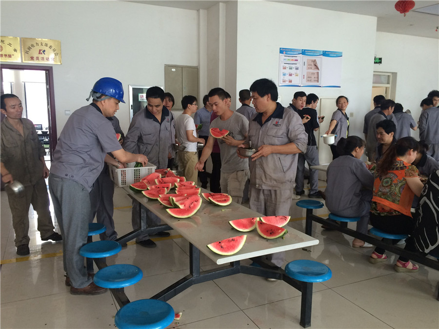 酷暑盛夏,熱浪滾滾,尤其近段時間,我市氣溫節節攀升,難以忍耐。“在如此高溫天氣下作業,生產一線員工的防暑工作是否到位?身體是否健康?”成了公司上下領導最為擔憂的。 為做好防暑降溫工作,保障生產一線員工的健康,確保員工身體健康平安度夏,董事長作重要指示,總經理和生產線相關領導作正確指導,從昨日起,由辦公室負責具體落實,為辛勤工作在生產建設一線的廣大員工送上了“夏日的清涼”。