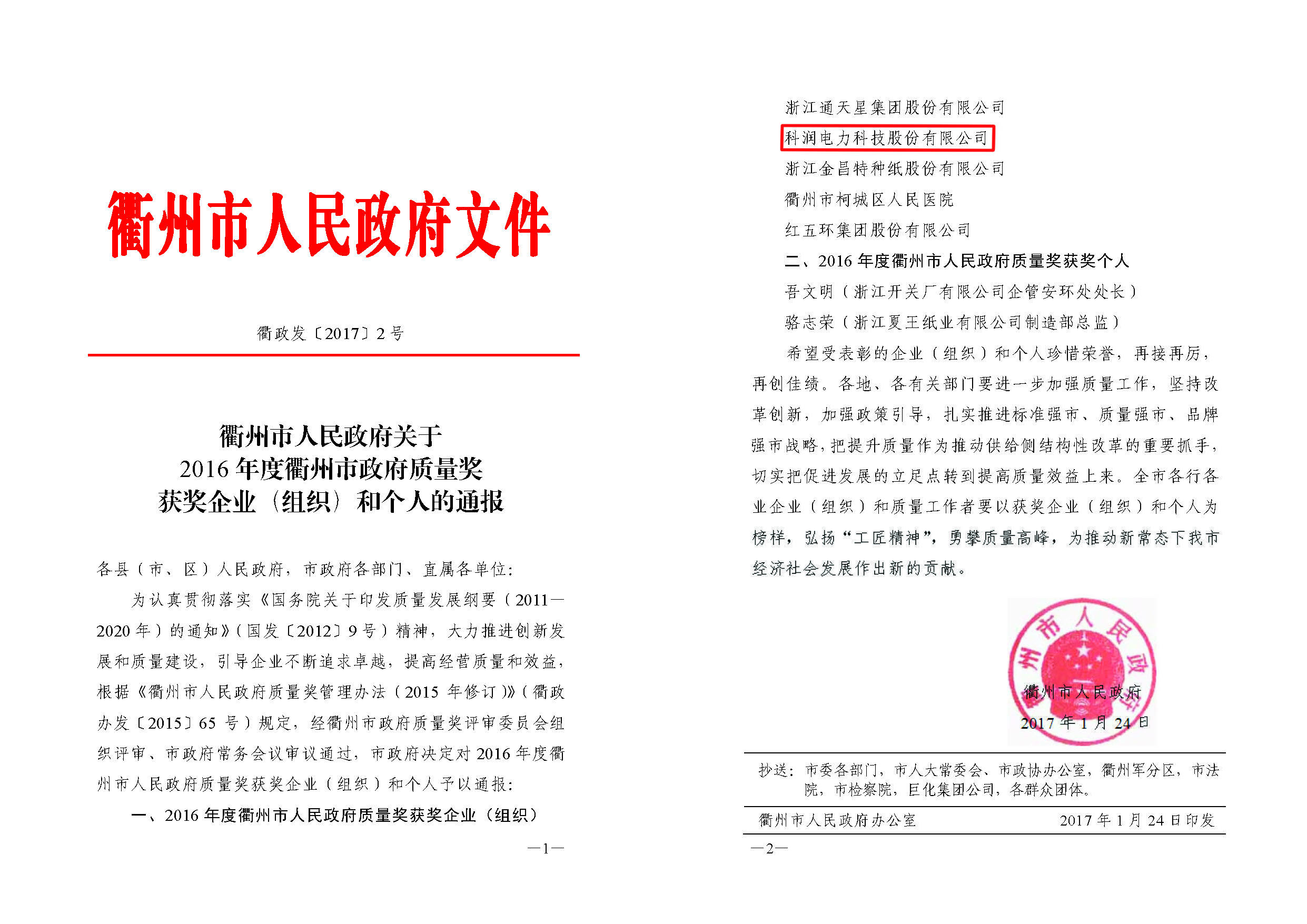2017年1月24日,公司獲評“衢州市人民政府質量獎”。