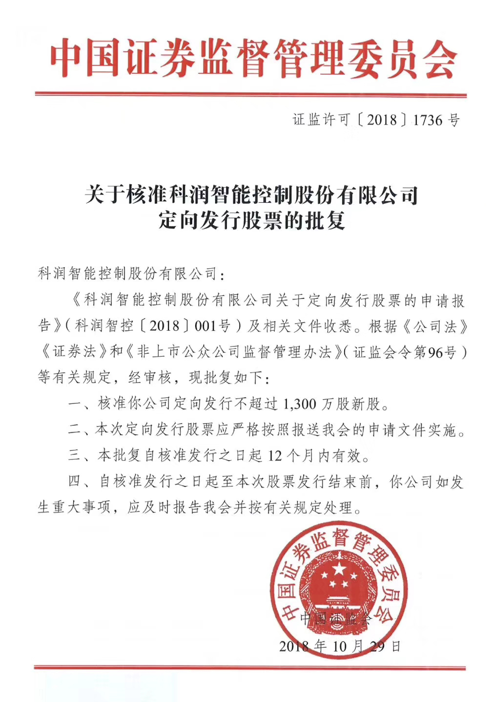 科潤獲證監(jiān)會(huì)“關(guān)于核準(zhǔn)定向發(fā)行股票的批復(fù)”