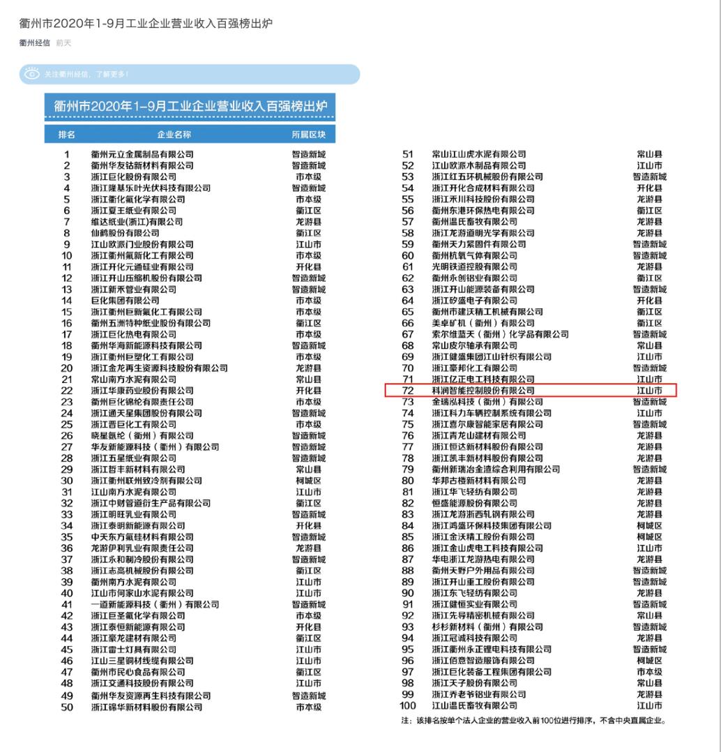 熱烈祝賀科潤智能控制股份有限公司被列入衢州市2020年1-9月工業企業營業收入百強榜。