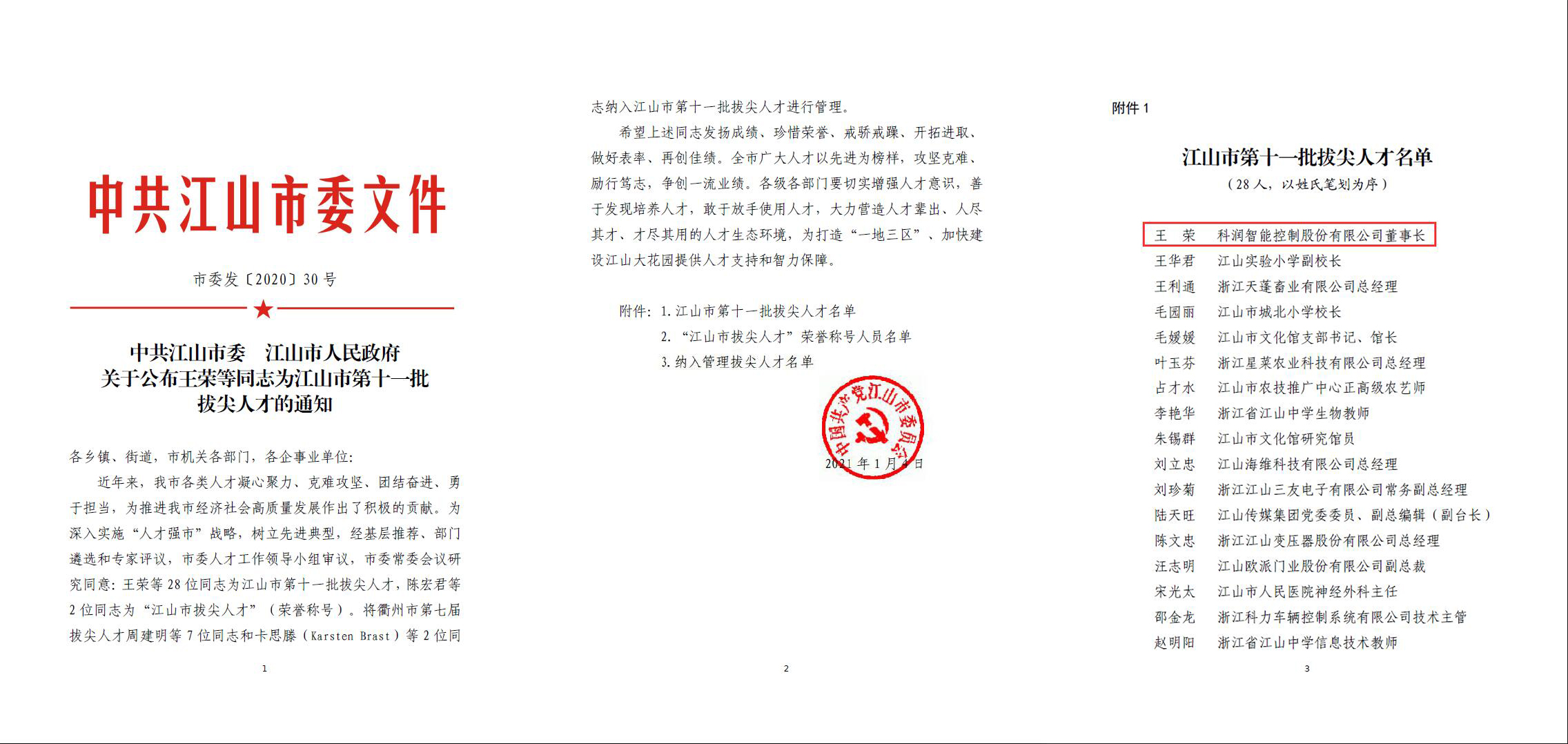 熱烈祝賀公司董事長王榮同志被授予“江山市第十一批拔尖人才”。