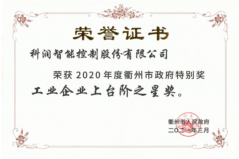 熱烈祝賀科潤(rùn)智控榮獲衢州市政府特別獎(jiǎng)“工業(yè)企業(yè)上臺(tái)階之星獎(jiǎng)”!