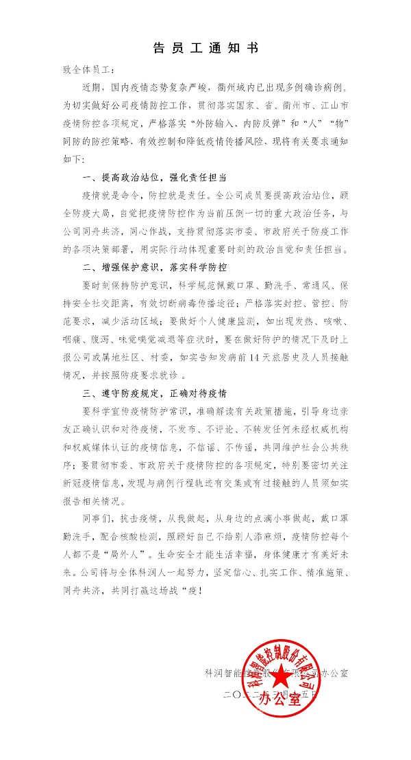 及時轉發衢州發布、江山發布等載體關于新型冠狀病毒防控常識、核酸檢測注意事項和最新疫情通報等,教育引導廣大員工以科學的態度認識疫情,并發出告員工通知書,號召全體員工用實際行動,共同守護幸福家園,展現科潤智控全體員工的擔當和力量。截止3月17日,公司全體員工已全部完成第一輪核酸檢測;對外來人員和車輛出入嚴格控制,要求正確佩戴口罩、掃碼、測溫、消毒、登記、查看48小時核酸報告;公司全域消毒;食堂錯時就餐,排隊間距控制在一米等。