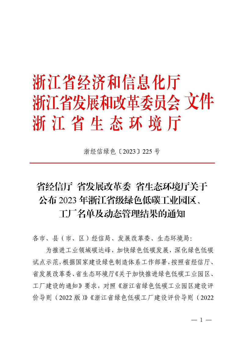 熱烈祝賀公司獲評2023年浙江省級綠色低碳工廠
